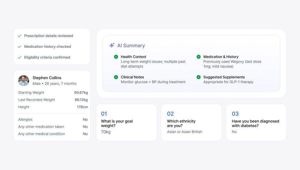 Every MHRA compliance checkpoint is pre-validated. Medical history is auto-summarised. Risk factors are flagged instantly. You make the clinical decision - the platform does the heavy lifting.